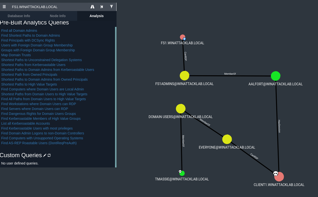 Based on the analysis we assume that FS1 is a file server and would be the final target. But to get there the first/next target/step is to own AALFORT. Aalfort is member of the FS1ADMINS group and has an acitve session on CLIENT1 we already own.