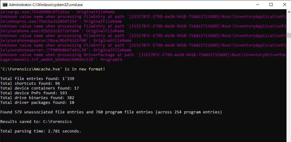 AmcacheParser.exe -f "C:\Forensics\Amcache.hve" -i –csv "C:\Forensics"