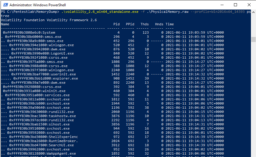 .\volatility_2.6_win64_standalone.exe -f .\PhysicalMemory.raw –profile=Win2016x64_1493 pstree | findstr „svchost services“