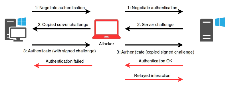 The attacker is authenticated on the server with the client’s credentials. Therefore the attacker is allowed to inject malicious commands into this relayed session.