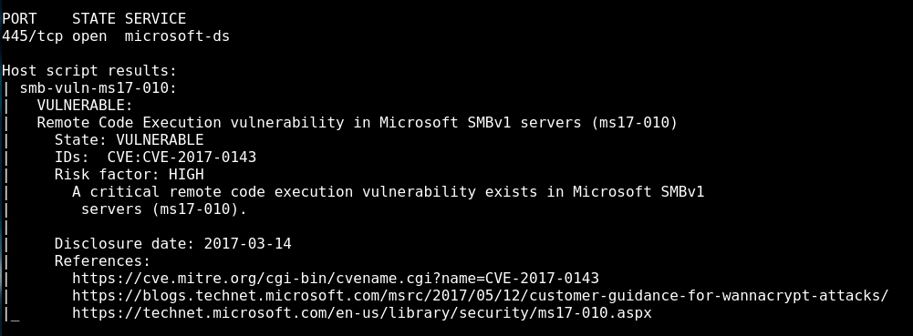 nmap -n -Pn -p 445 --script smb-vuln-ms17-010 -iL targets.txt -oA nmap_script_eternalblue