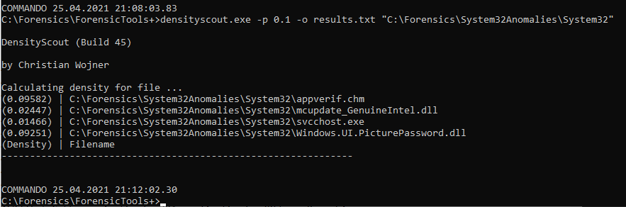 densityscout.exe -p 0.1 -o results.txt "C:\Forensics\System32Anomalies\System32"