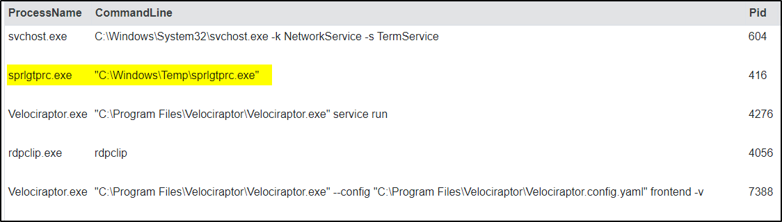 sprlgtprc.exe executed from C:\Windows\Temp looks suspiscious to me!