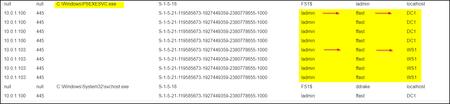 - Use Windows Event ID 4648 to find out the user that executed PsExec to become Domain Administrator ffast on destination computer (i.e. DC1). Provide an Artifact for this purpose. It should show at least the parameters SubjectUserName, TargetUserName, TargetServerName and LogonTime (in date time format) from Windows Event ID 4648.
