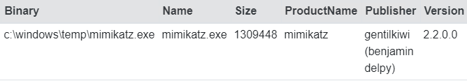 C:\Windows\Temp\mimikatz.exe file:///C:/Windows/appcompat/Programs/Amcache.hve#%5CRoot%5CInventoryApplicationFile%5Cmimikatz.exe%7C9a39181795af917